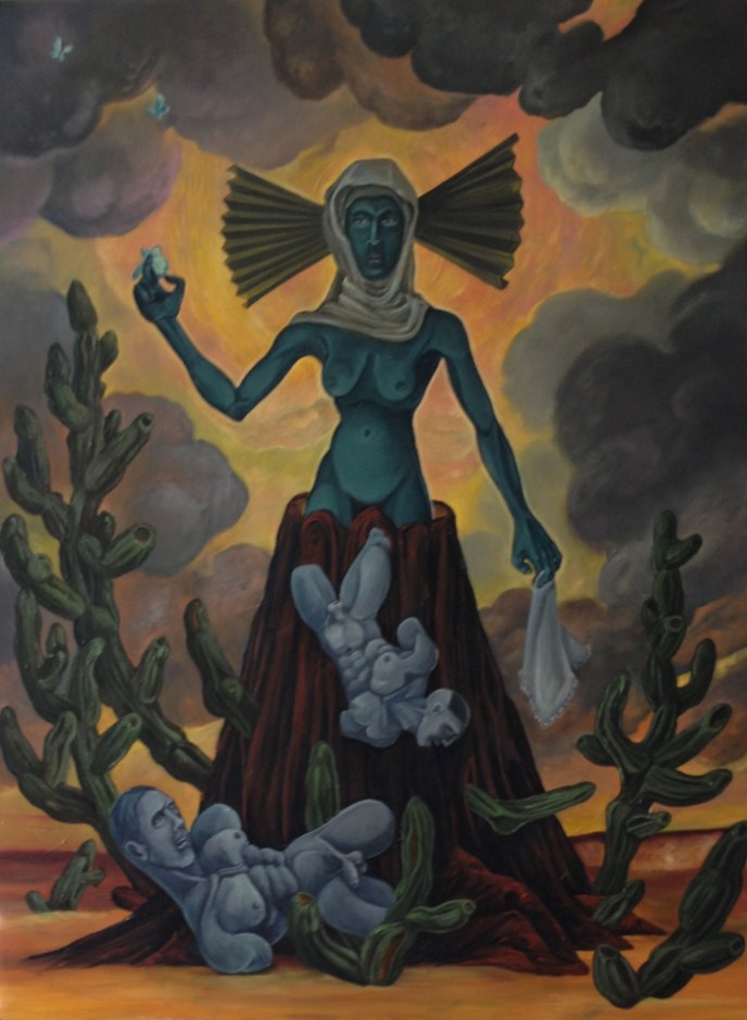 Tlazoltéotl, a difficult birth, 2014, oil on Masonite, 18 by 24″
