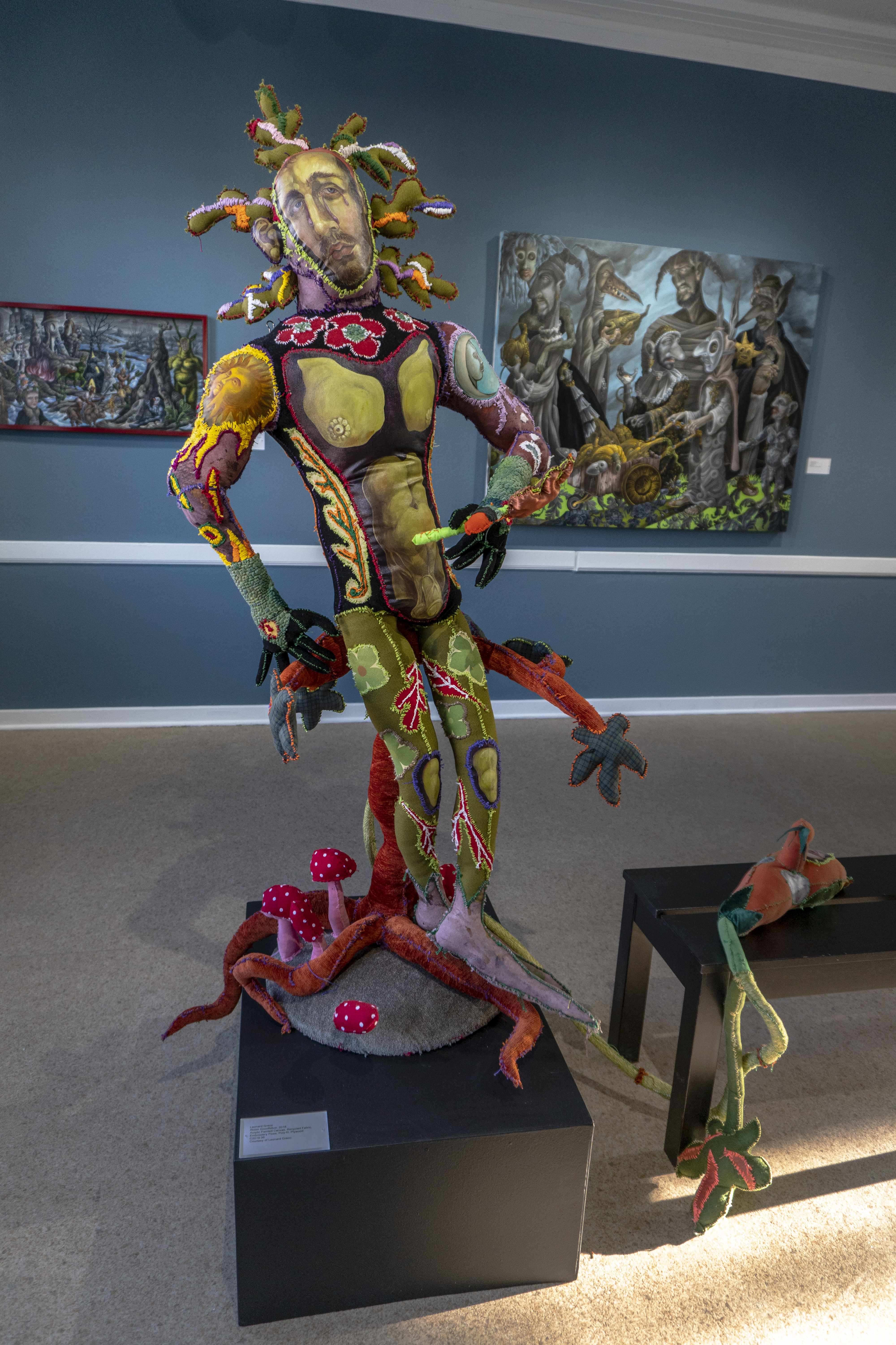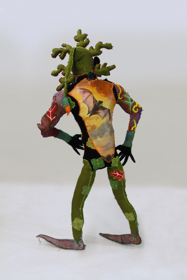Mixed media: acrylic painted canvas, recycled fabric, embroidery floss, black-pipe and plywood interior structure, poly-fil