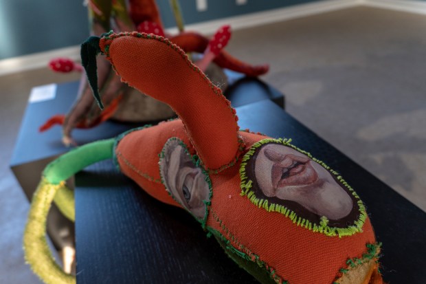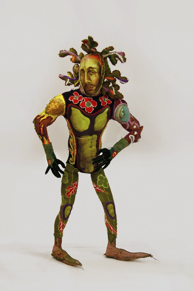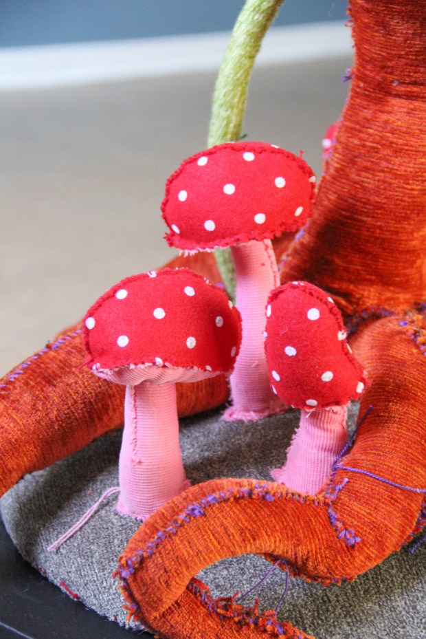 Acrylic painted canvas, recycled fiber, embroidery floss, poly-fil