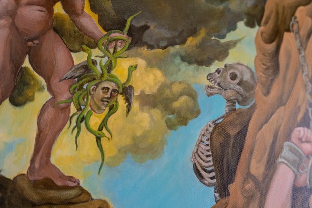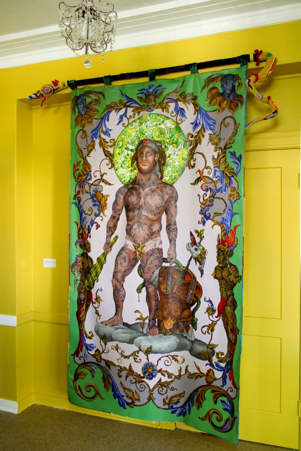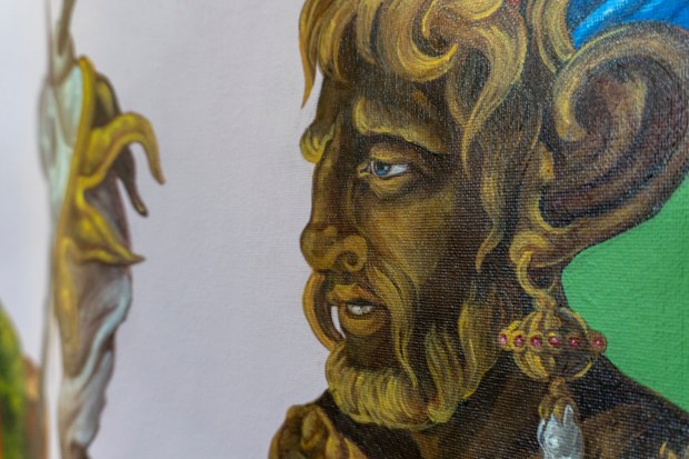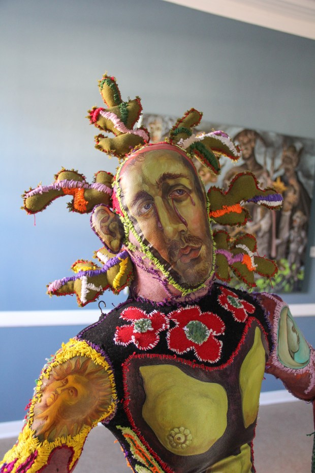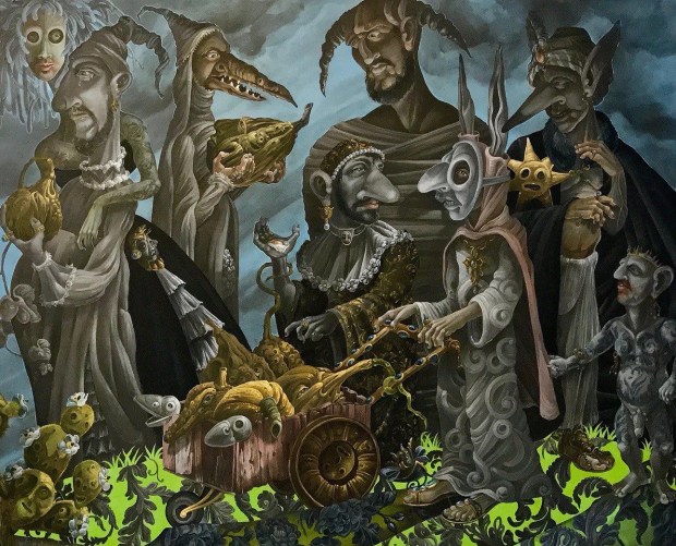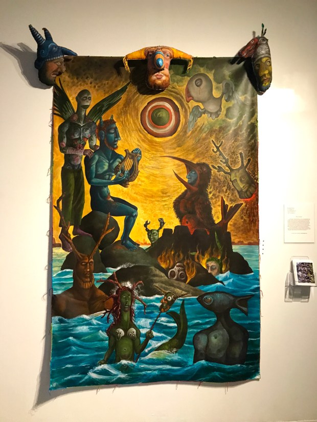 Among other things, it touches on the weighty tableau of the Temptation of St. Anthony of the Desert and the perilous trials of Herakles. My aesthetic expression is influenced by my instinctive inclination to lighten somber somewhat ponderous existential themes with a gay touch (consciously using this word in both its current identity-laden fraught understanding and the anachronistic yet more delightful sense). While the work possesses decidedly camp sensibilities it is never ironic as is so often the current fashion. I find irony frequently cynical; my work is never cynical for no other reason than the inherent affection I hold for my motley crew of heroes, saints and sinners .