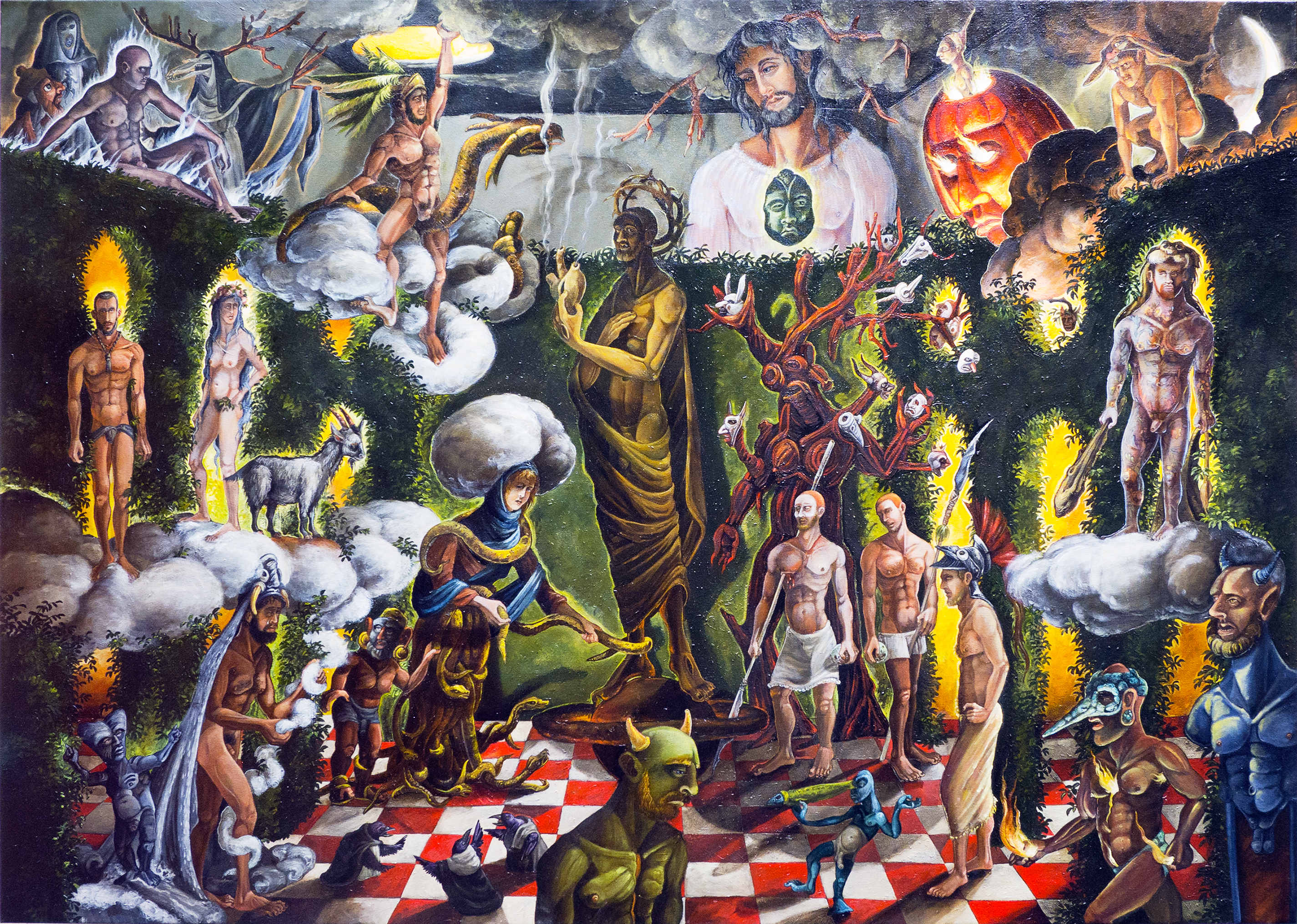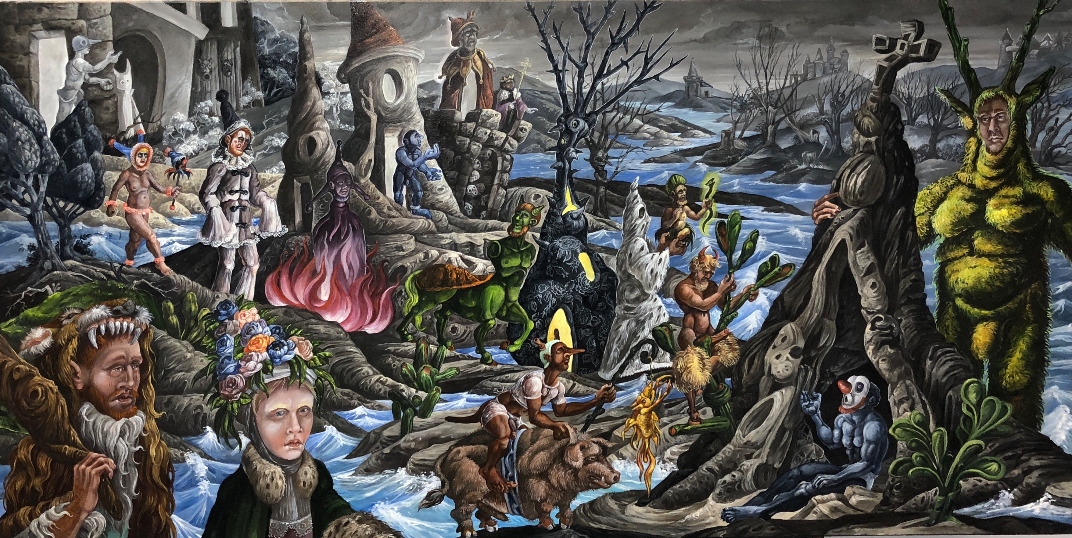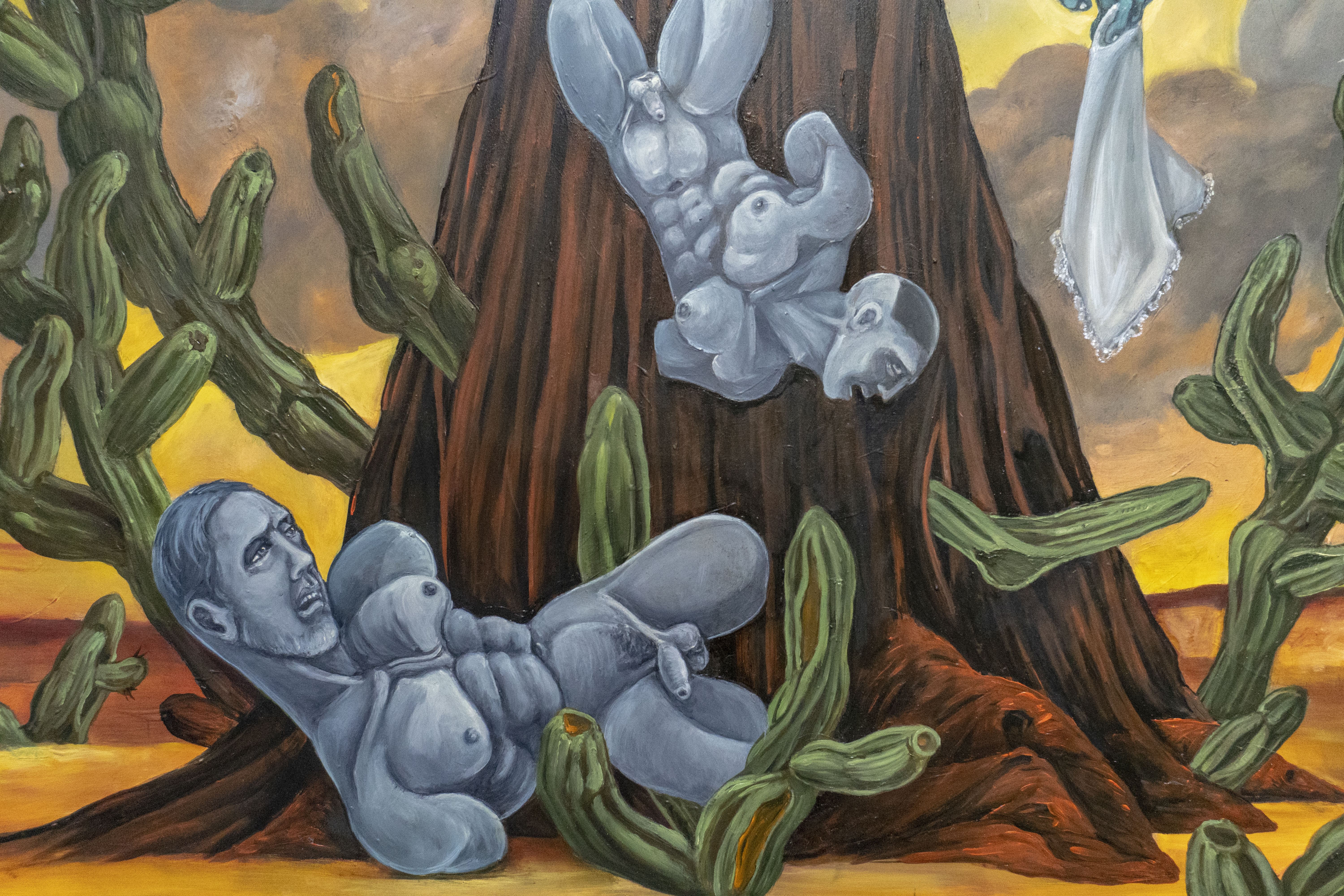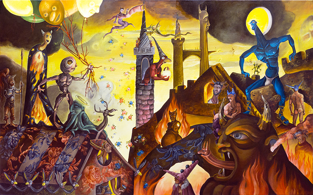 Among other things, it touches on the weighty tableau of the Temptation of St. Anthony of the Desert and the perilous trials of Herakles. My aesthetic expression is influenced by my instinctive inclination to lighten somber somewhat ponderous existential themes with a gay touch (consciously using this word in both its current identity-laden fraught understanding and the anachronistic yet more delightful sense). While the work possesses decidedly camp sensibilities it is never ironic as is so often the current fashion. I find irony frequently cynical; my work is never cynical for no other reason than the inherent affection I hold for my motley crew of heroes, saints and sinners .