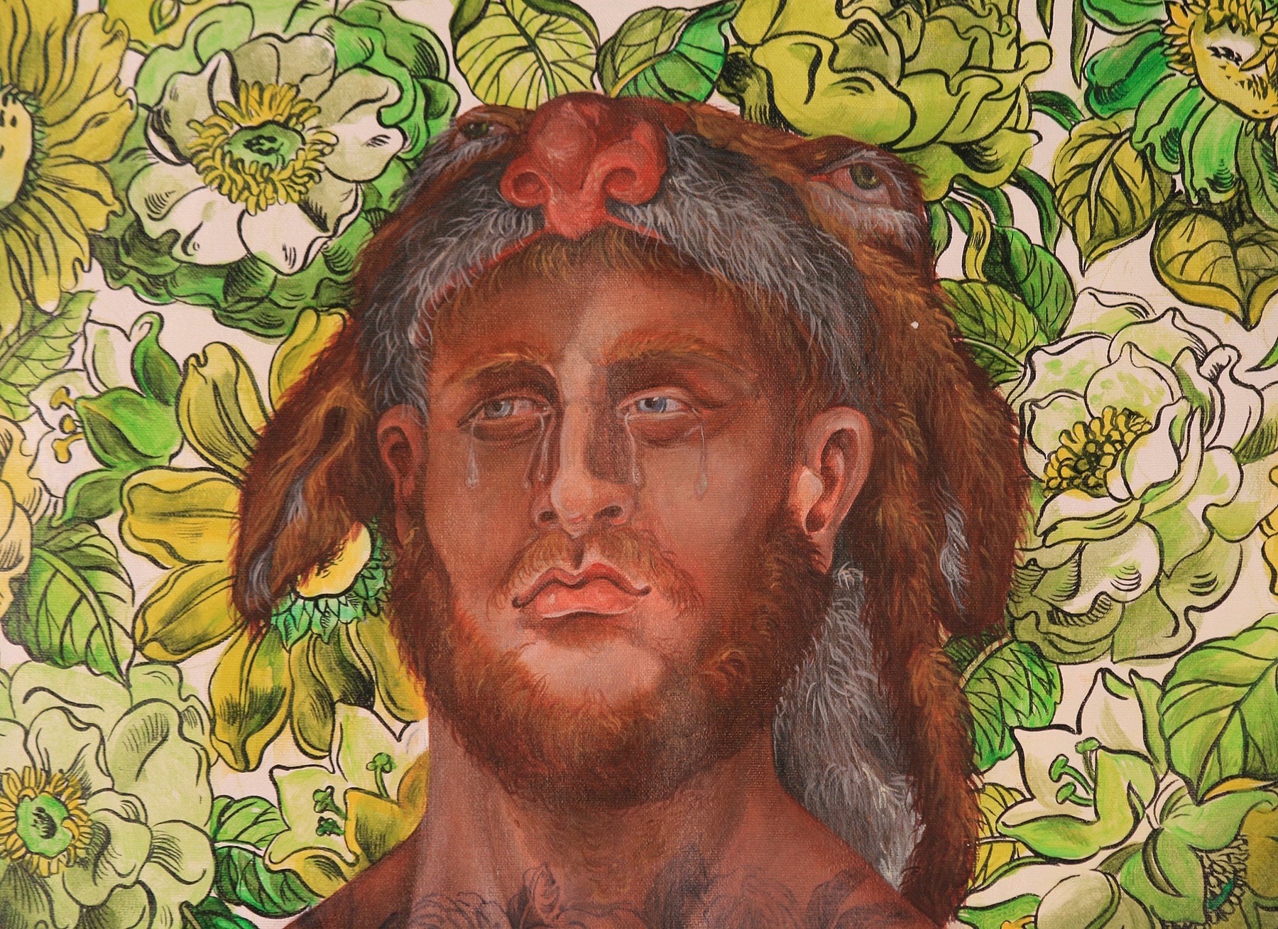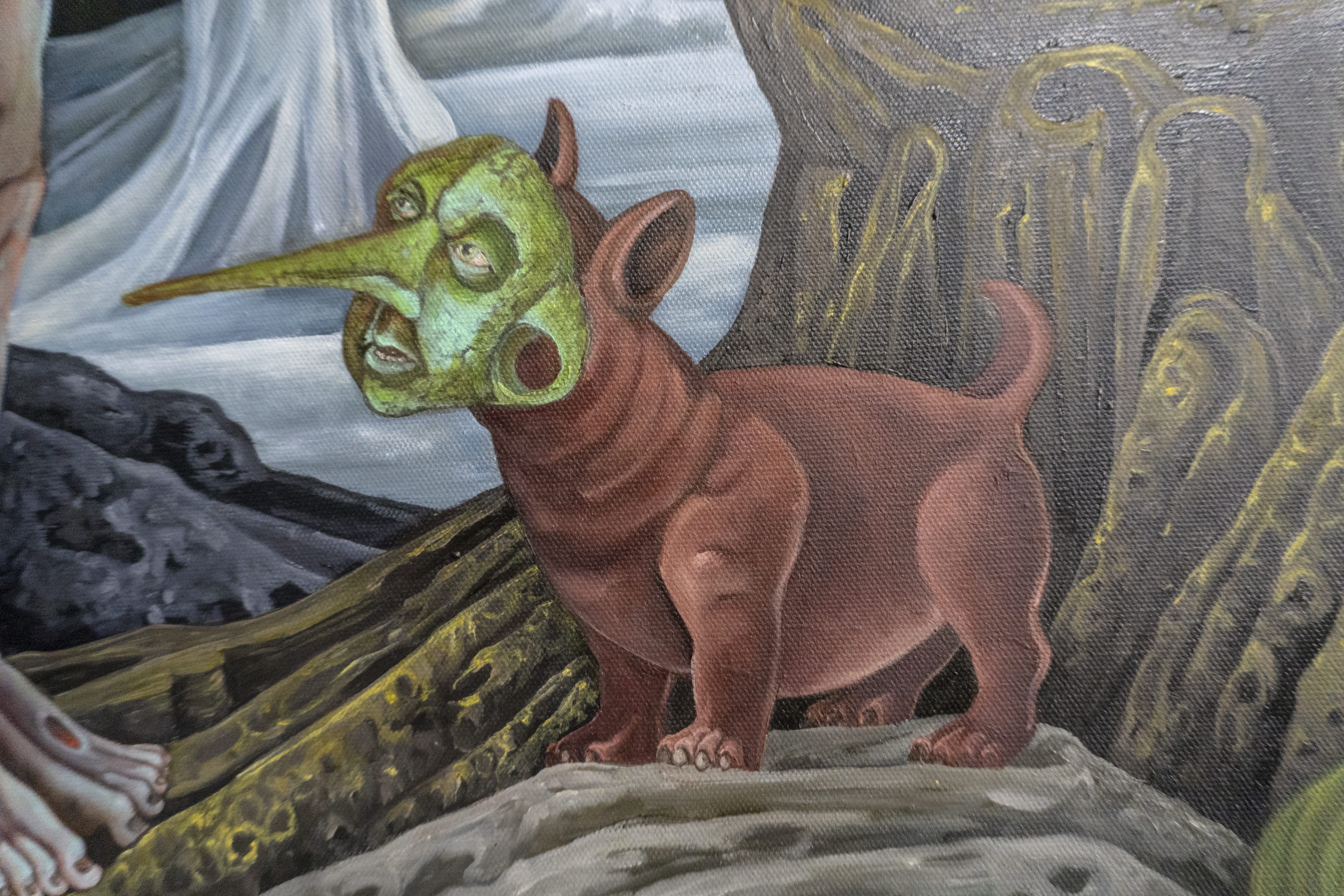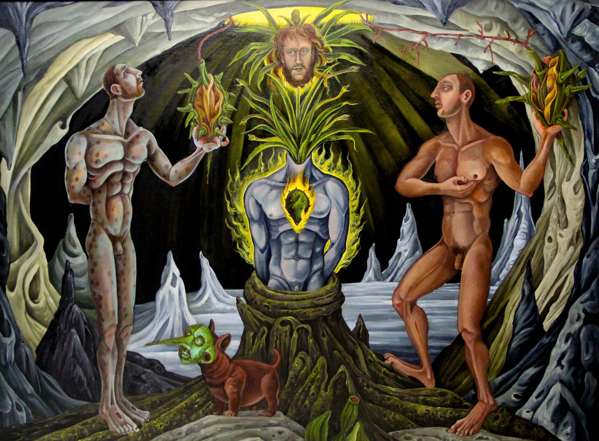 Among other things, it touches on the weighty tableau of the Temptation of St. Anthony of the Desert and the perilous trials of Herakles. My aesthetic expression is influenced by my instinctive inclination to lighten somber somewhat ponderous existential themes with a gay touch (consciously using this word in both its current identity-laden fraught understanding and the anachronistic yet more delightful sense). While the work possesses decidedly camp sensibilities it is never ironic as is so often the current fashion. I find irony frequently cynical; my work is never cynical for no other reason than the inherent affection I hold for my motley crew of heroes, saints and sinners .